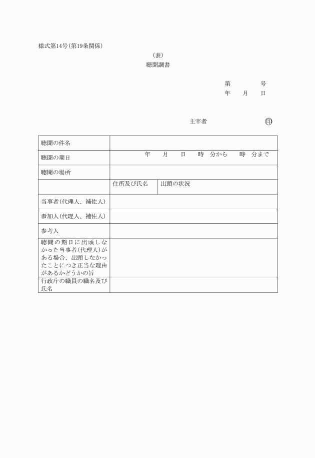 第19条 法第24条第1項の調書は、聴聞調書(様式第14号)によるものとし、主宰者が記名押印するものとする。