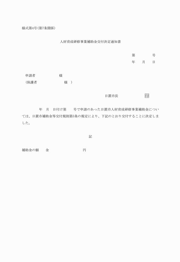 第7条 規則第7条の規定による補助金等の交付の決定通知は、人材育成研修事業補助金交付決定通知書(様式第4号)により行うものとする。
