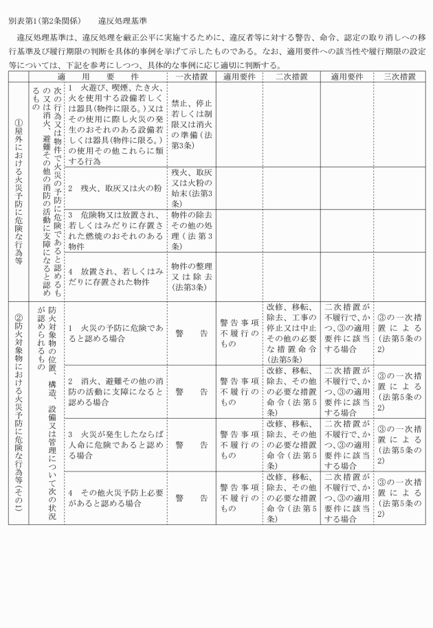 2 消防署長(以下「署長」という。)が行う違反の処理は、別表第1によるものとする。