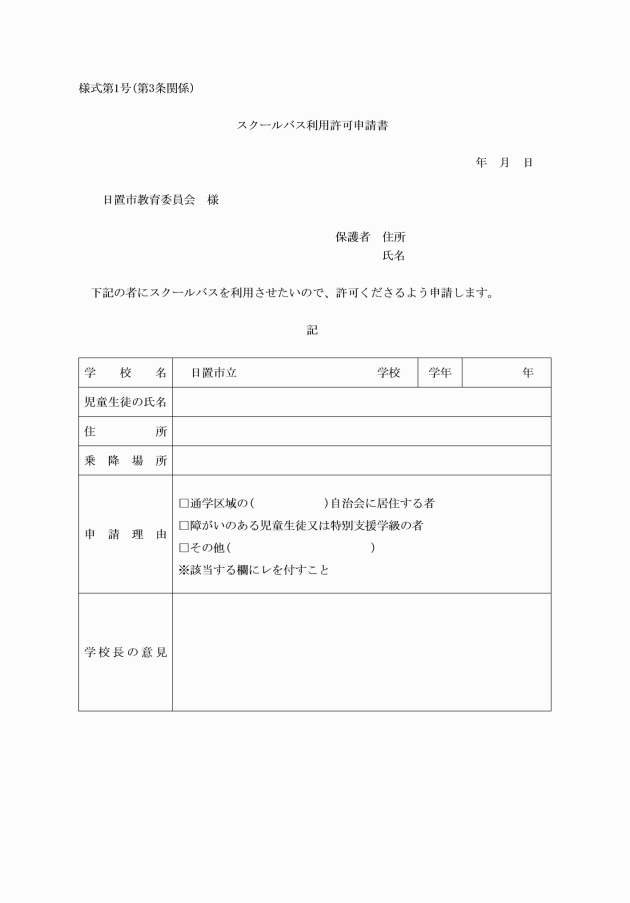 第3条 スクールバスを利用しようとする児童生徒の保護者は、スクールバス利用許可申請書(様式第1号)を学校長に提出し、学校長は意見を付して教育委員会に提出しなければならない。
