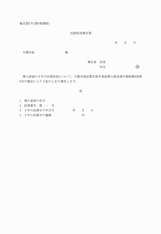 (6) 貸付期間中毎年度末の導入素畜の子牛の出荷状況を出荷状況報告書(様式第5号)により市長に報告すること。