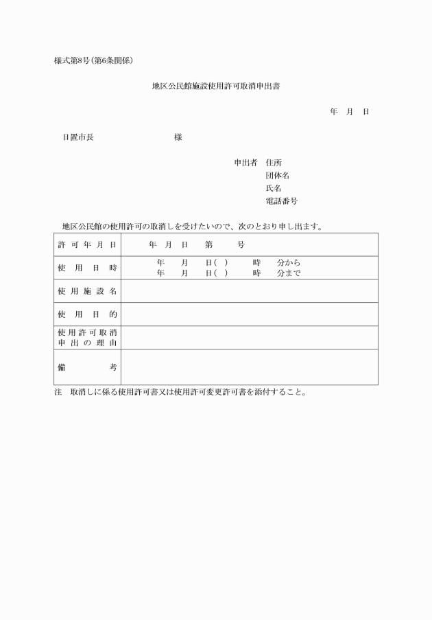 第3条 使用許可の内容の変更の許可(以下「変更許可」という。)を受けようとする者は、地区公民館施設使用許可変更許可申請書(様式第3号)に当該変更に係る使用許可書を添えて、市長に提出しなければならない。