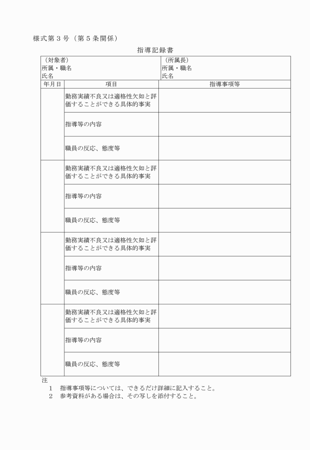 第5条 所属長は、必要と認める期間、指導対象職員に対して注意及び指導を行うとともに、必要に応じて職場研修、担当職務の見直し等を実施するものとする。この場合において、所属長は、当該指導対象職員に対する注意及び指導の内容並びに職場研修等の実施状況について、指導記録書(様式第3号)に記録しなければならない。