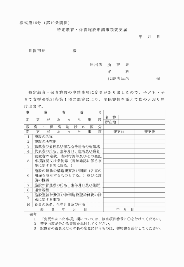 第19条 法第35条第1項の規定による届出は、特定教育・保育施設申請事項変更届(様式第16号)により行わなければならないものとする。