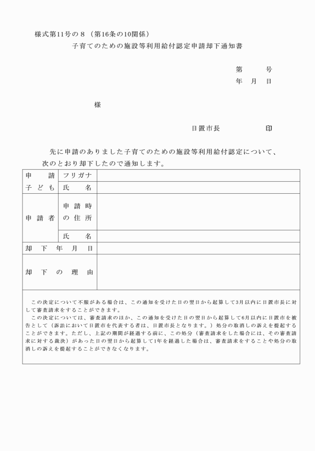 2 法第30条の5第4項の規定による通知は、子育てのための施設等利用給付認定申請却下通知書(様式第11号の8)により行うものとする。