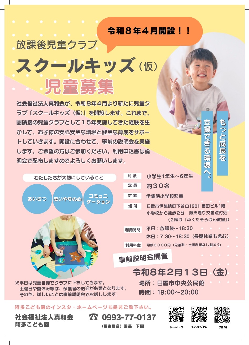 4月1日より、新しく伊集院小学校区に放課後児童クラブ「スクールキッズ(仮称)」が開所されます。