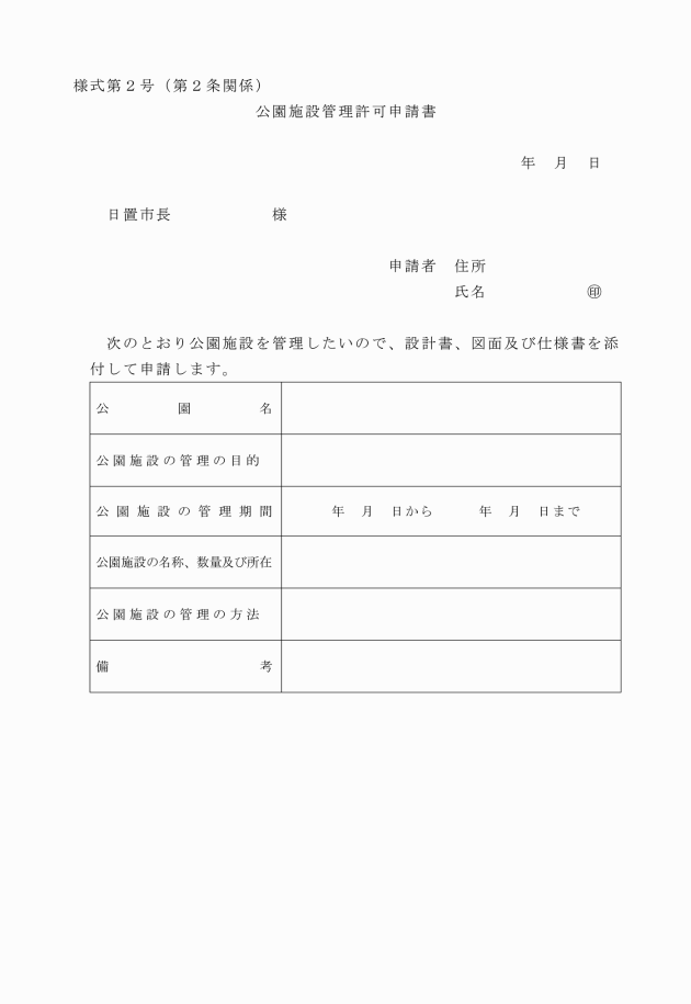 第2条 都市公園法(昭和31年法律第79号。以下「法」という。)第5条第1項の規定により公園施設の設置の許可を受けようとする者は、あらかじめ公園施設設置許可申請書(様式第1号)に次に掲げる書類を添付して市長に提出しなければならない。