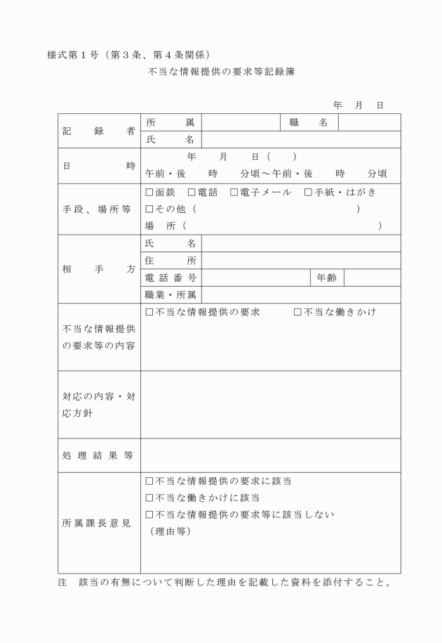 3 職員は、不当な情報提供の要求等又はその疑いのある要求等を受けたときは、相手方の氏名、連絡先等を確認し、その者に対して不当な情報提供の要求等記録簿(様式第1号。以下「記録簿」という。)を作成する旨及び当該記録簿は公表することがある旨を告知するよう努めるものとする。